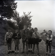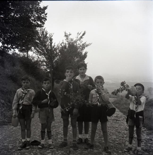 Retrato en plano entero de un grupo de 5 niños y adolescentes, uniformados con pañoleta del grupo scout de Villava, con una monitora en un camino en el monte.