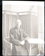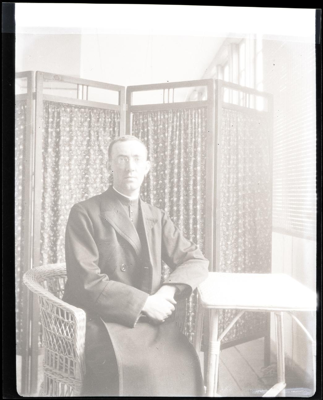 • Contenido: Retrato en plano americano de Ambrosio Azparren Orrio, sacerdote, con dulleta sentado en una mesa. De fondo, un biombo.