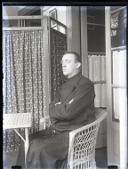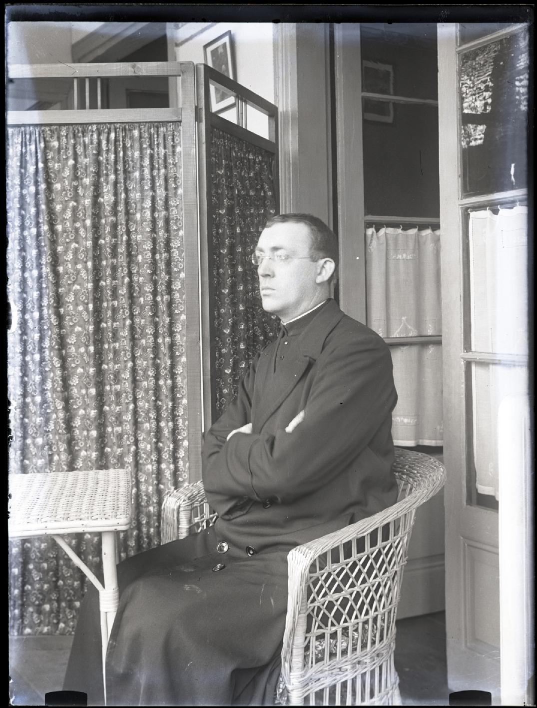 • Contenido: Retrato en plano americano y tres cuartos de Ambrosio Azparren Orrio, sacerdote, con dulleta sentado en una mesa. De fondo, un biombo.