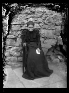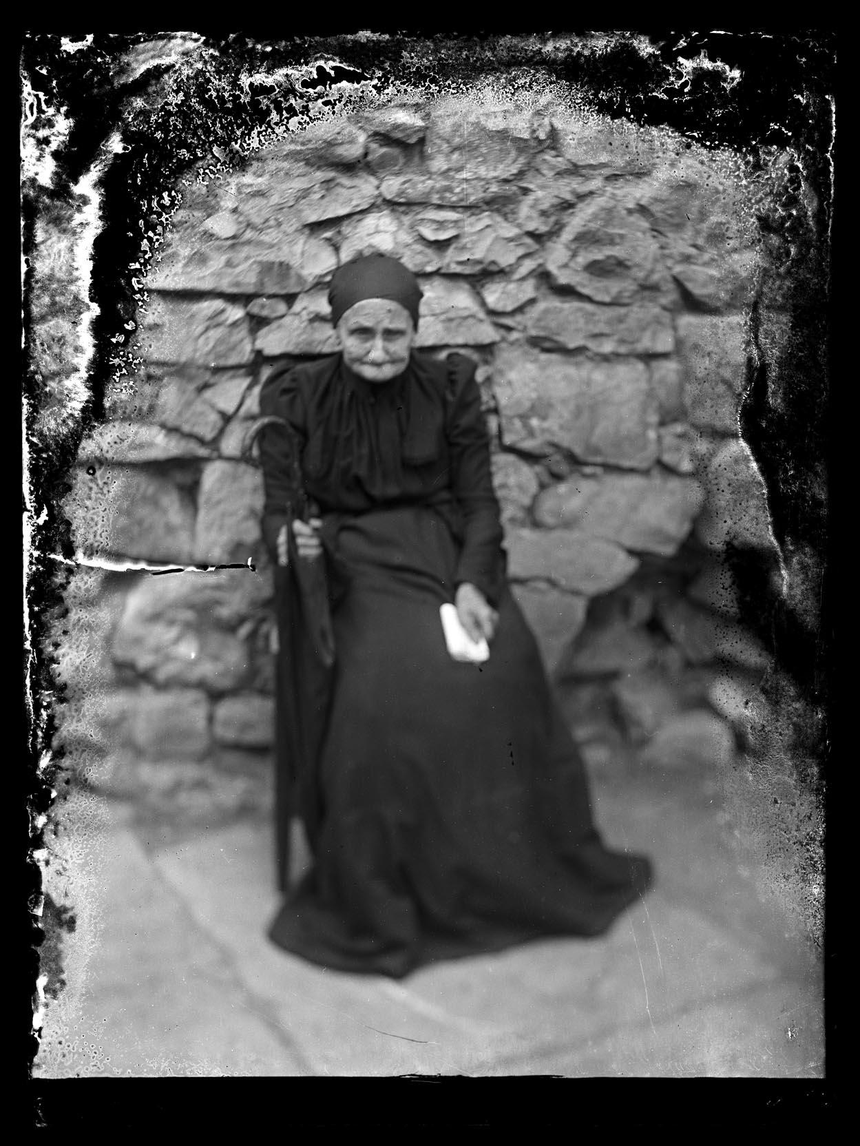 • Contenido: Retrato en plano entero de una mujer anciana con un paraguas sentada con un muro de fondo.