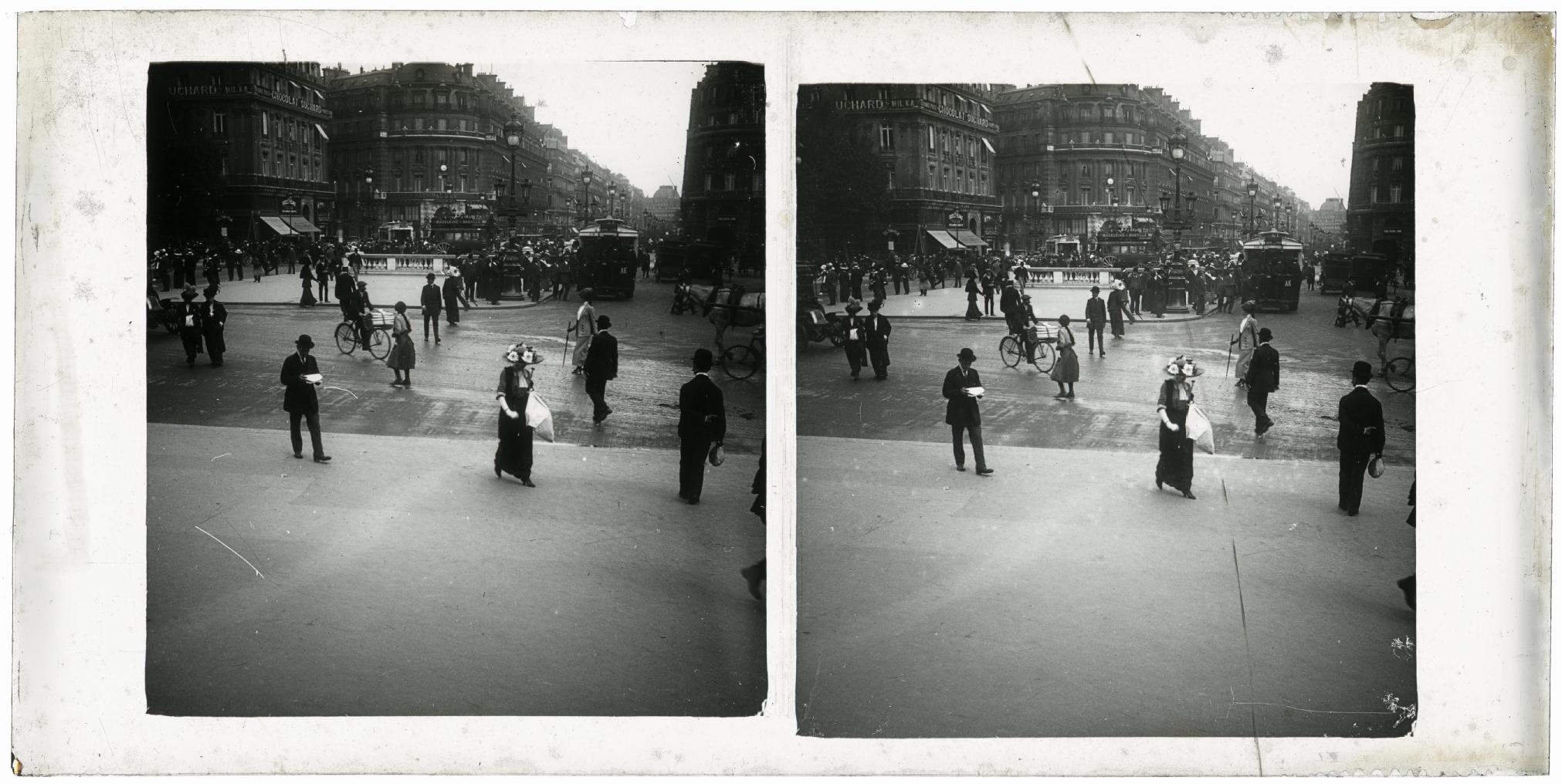 Vista de la avenida de la Ópera de París, tomada desde el norte junto al boulevard de las Capuchinas. En primer término, un grupo de personas caminando por la calle. En segundo plano, la plaza de la Ópera. En la izquierda, el edificio de CHOCOLAT SUCHARD y, a continuación, el actual edificio del Banco Nacional de París con el antiguo rótulo de COMPTOIRE NATIONAL DESCOMPTS. Ante el edificio, un carruaje de la línea MADELEINE - BASTILLE. En la derecha, otro vehículo de GARE LYON. Al fondo, el hotel de Louvre.