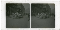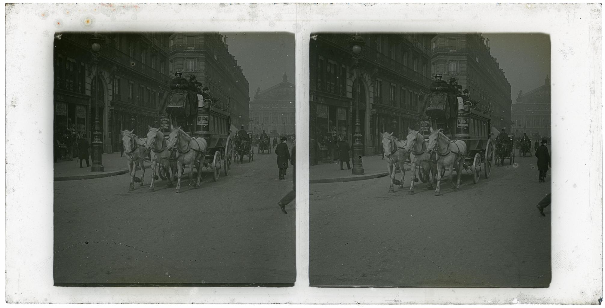 Vista de la avenida de la Ópera de París, tomada desde el sur. En primer término, un carruaje de transporte público tirado por 3 caballos en la calzada de la avenida. Detrás, 2 carruajes y, al fondo, la fachada del palacio Garnier o de la Ópera.