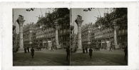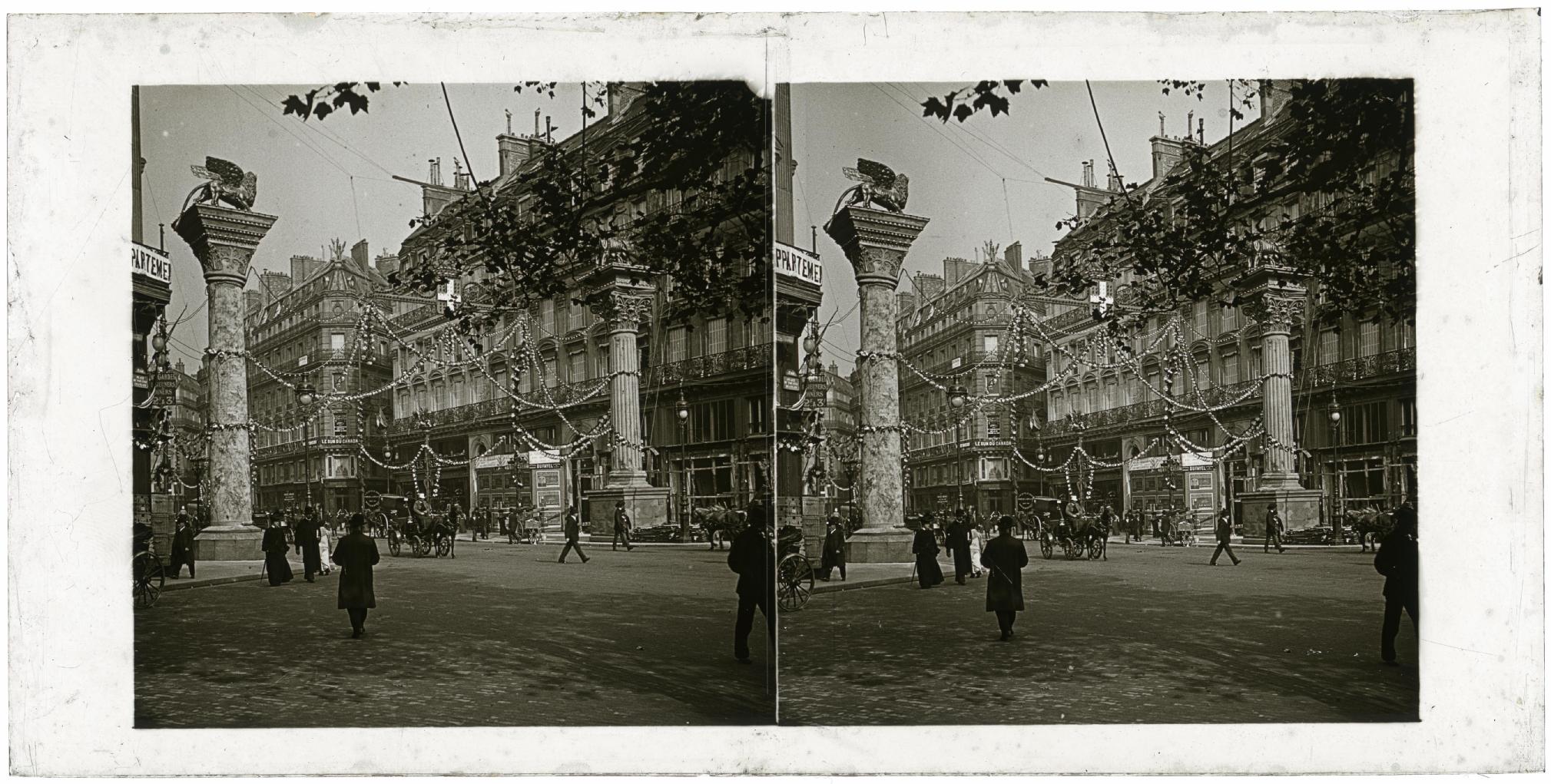 Vista de la avenida de la Opera de París, tomada desde el norte, engalanada. En primer término, la calzada con carruajes tirados por caballos y personas caminando. A ambos lados, 2 columnas conmemorativas rematadas por una loba capitolina y el león de San Marcos formando un arco triunfal efímero con el escudo de los Saboya suspendido. Detrás, las fachadas de los edificio de la avenida están engalanadas para celebrar alguna conmemoración.
