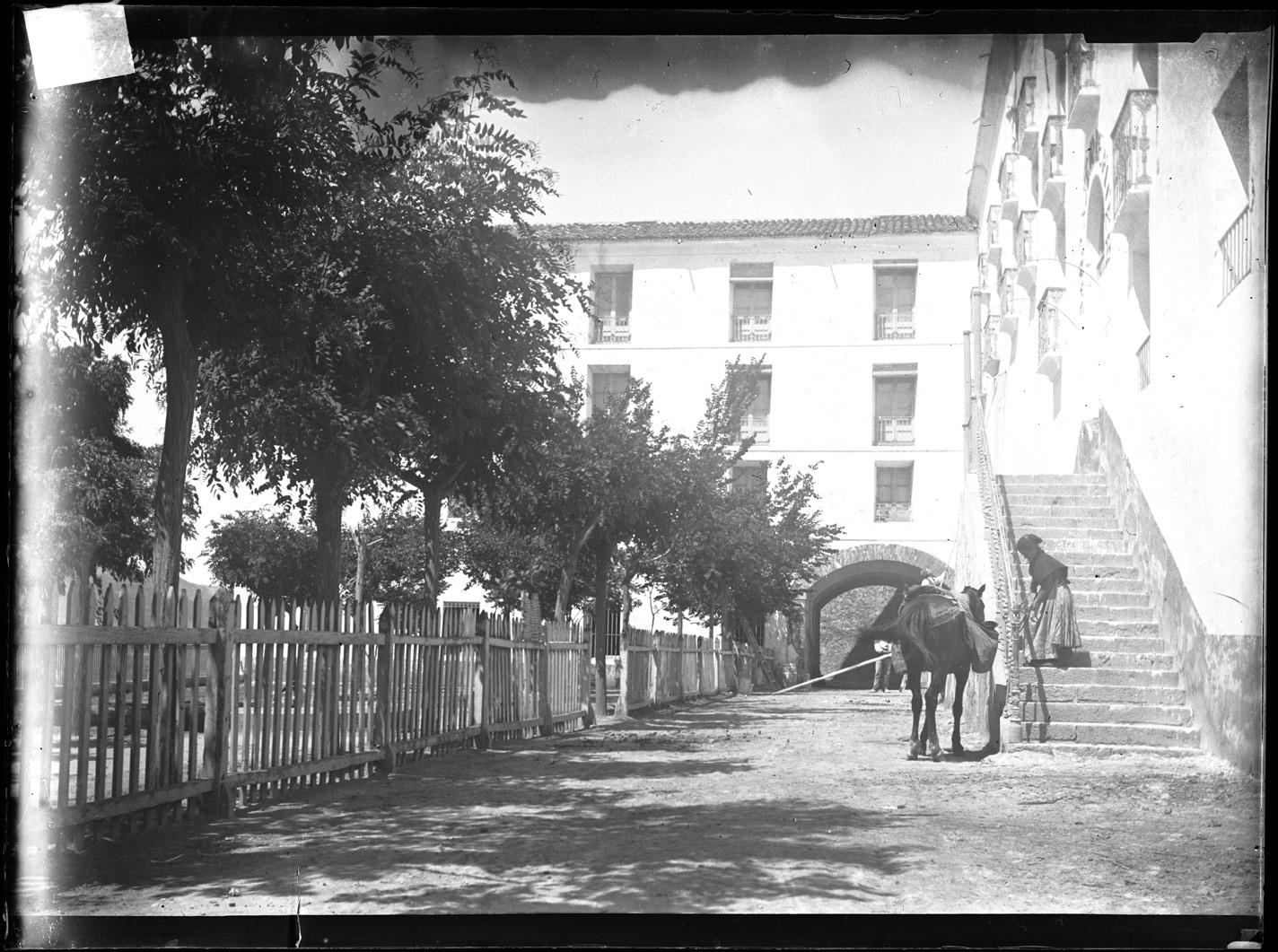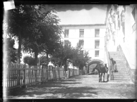 Vista general exterior de los Baños Nuevos del Balneario de Fitero, tomada desde el túnel de acceso a las instalaciones de la carretera Fitero - Cervera del Río Alhama (La Rioja), al este. En la derecha, junto alas escaleras, una mujer con un caballo.