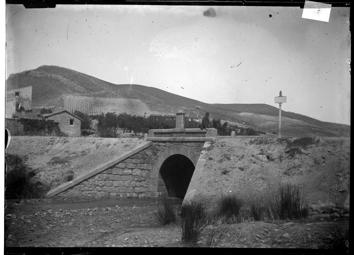 En el reverso, sobre la emulsión, etiqueta adhesiva de papel con numeración manuscrita ("6"). Julio Altadill regresó a Navarra tras servir como profesor en la Academia del Cuerpo Administrativo del Ejército de Ávila hasta 1891, donde desarrolló su actividad como fotógrafo aficionado hasta su muerte el 4-5-1935. La imagen fue reproducida en una publicación en 1918 con el pie de imagen: "La carretera (radial A-I) al llegar al confín provincial".