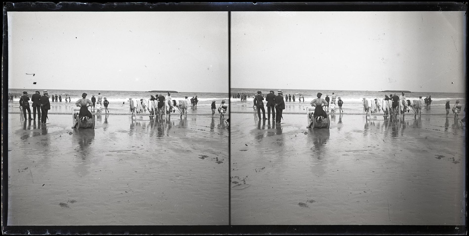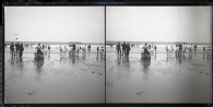 Escena de bañistas en la orilla de la playa de Biarritz, departamento de Pirineos Atlánticos, Francia. En primer término, de izquierda a derecha, 3 hombres con traje y sombrero, una mujer sobre una gran bobina de cuerda y flotadores y, a su lado, una estructura de madera para dejar colgada la ropa. En segundo plano, los bañistas.