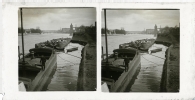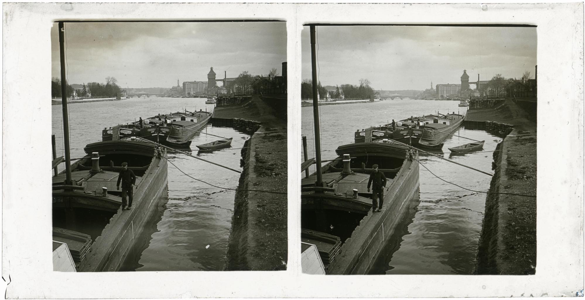 • Contenido: Vista de 3 barcazas atracadas en un puerto en el río Sena, en París. En primer término, las barcazas y 2 hombres sobre 2 de ellas. En segundo plano, el río. Al fondo, un puente y, en la derecha, varios edificios industriales.