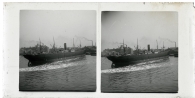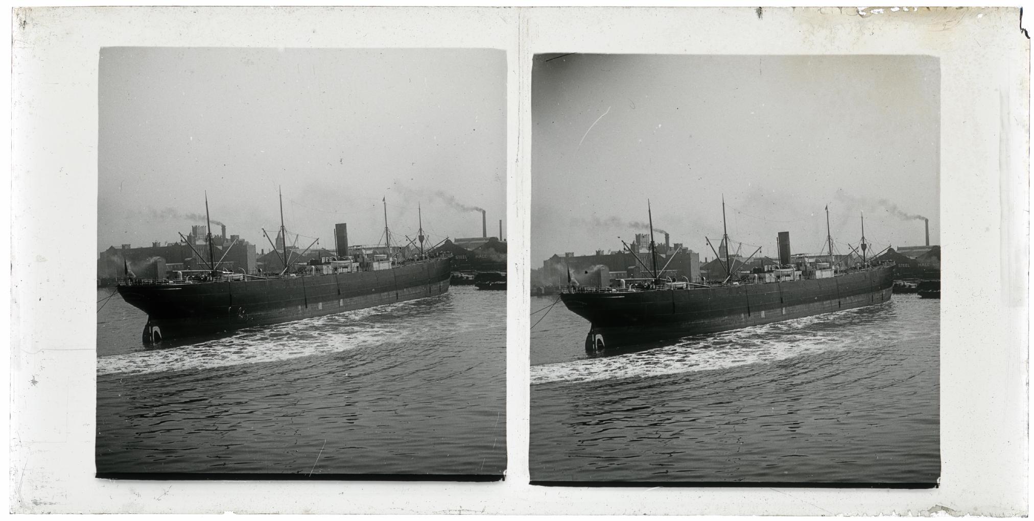 Vista de un barco de mercancías entrando al puerto de Liverpool, Reino Unido. En primer término, el barco. En segundo plano, los edificios del puerto y, en la derecha, los almacenes de descarga de diferentes materiales. En uno de ellos se lee STEEL y, en el contiguo, HALL AND PICK.