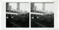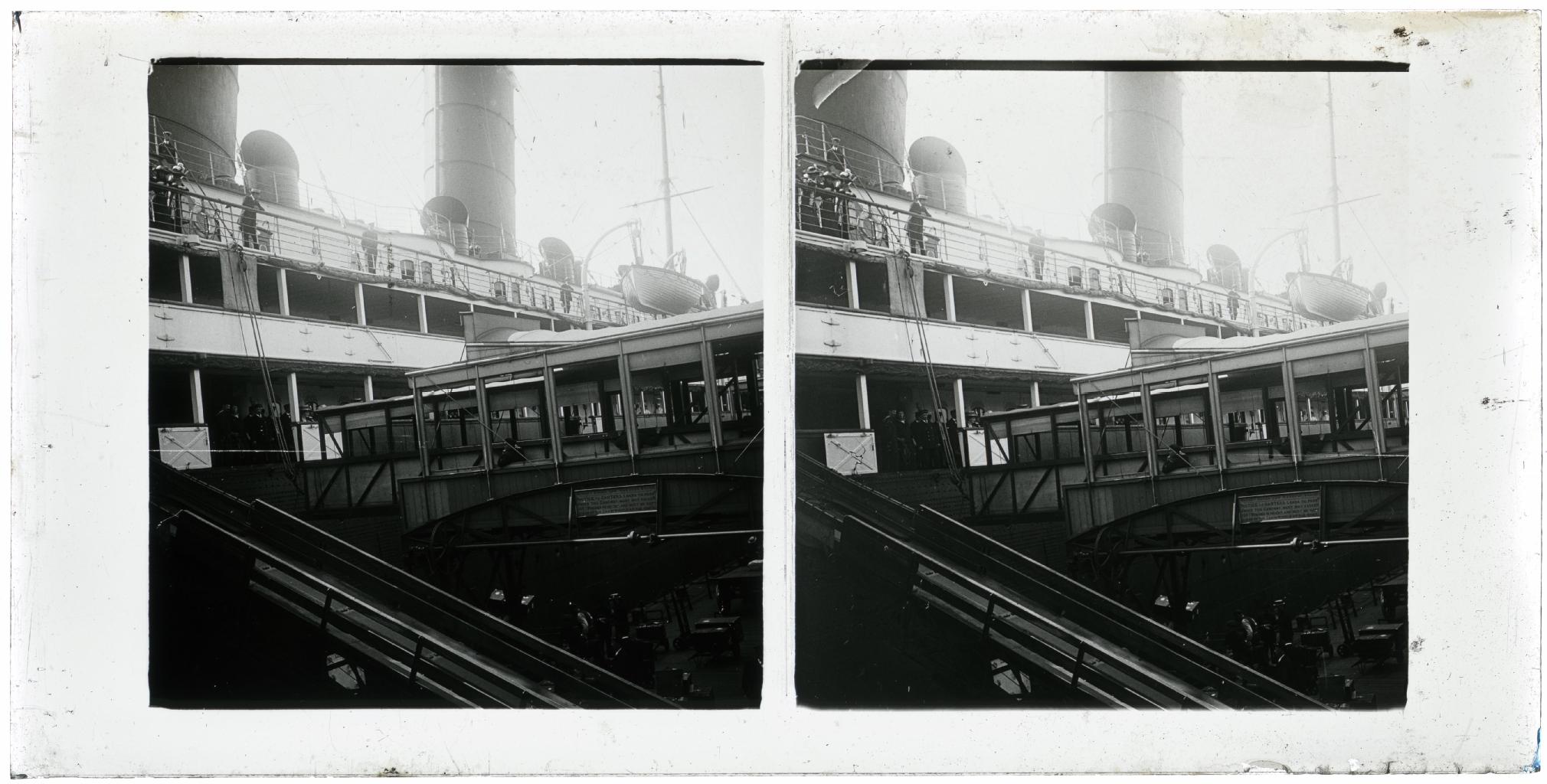 Vista parcial de un barco trasatlántico atracado en el puerto de Liverpool, Reino Unido, acoplando la pasarela de desembarque. En primer término, una pasarela. En segundo plano, la estructura de desembarque con el letrero: MENSEY DOCKS AND HARBOUR BOARD / NOTICE TO CARTERS. LOADS TO PASS / UNDER THIS GANGWAY. MUST NOT EXCEED / () OF 19 INCHES IN HEIGHT, AND MUST BE KEPT / CLEAR OF THE CHAIN WHEELS AT THE SIDES. En segundo plano, el barco y un grupo de personas esperando al acople de la estructura.