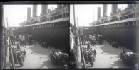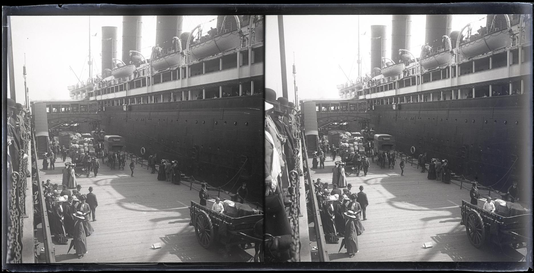 Vista parcial de un barco trasatlántico atracado en el puerto de Liverpool, Reino Unido, con la pasarela de desembarque. En primer término, un numeroso grupo de personas en el muelle junto a carros cargados con equipaje y tirados por caballos. En segundo plano, la estructura de desembarque acoplada al barco.