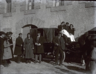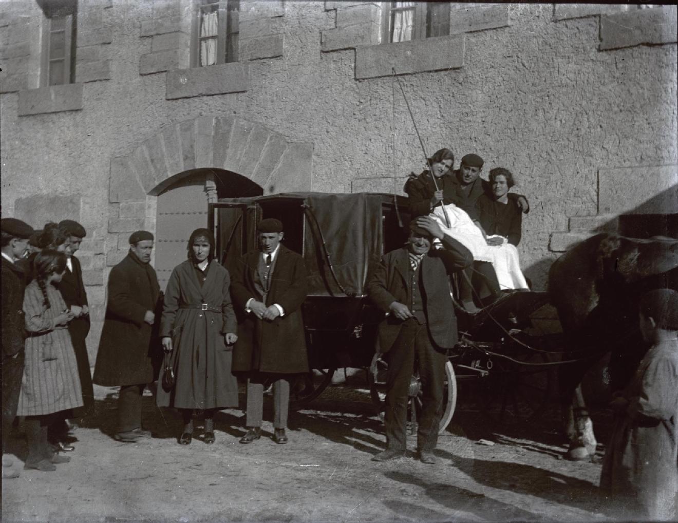 Retrato en plano entero de una pareja de novios el día de su boda en la fachada de casa Castiella de la localidad de Echauri. En el centro de la imagen, los novios, en la izquierda un grupo de personas, en la derecha, un hombre y un niño. En segundo plano, un carruaje tirado por un caballo y 3 personas sobre él. De fondo, la portada de la casa localizada en la carretera de Echauri, junto a Ibero.