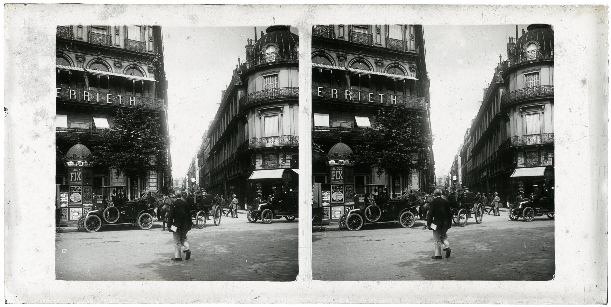 Vista parcial del boulevard de los Italianos en París, tomada desde el sur. En primer término, un hombre cruzando la calle y, detrás, 2 automóviles y un carruaje tirado por un caballo. En segundo plano, la calle Laffitte y, al fondo, la iglesia de Nuestra Señora de Loreto.