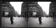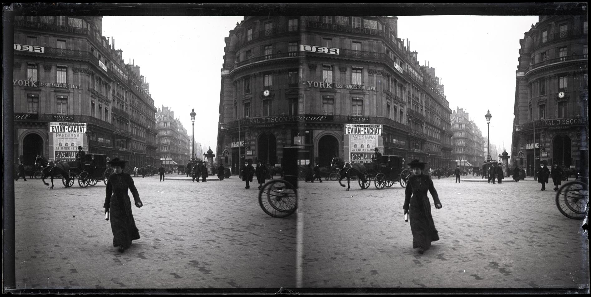 • Contenido: Vista de la calle 4 de Septiembre de París, tomada desde la plaza de la Ópera. En primer término, una mujer andando por la calzada. En segundo plano, las fachadas de los edificios de la avenida de la Ópera. En el de la izquierda se leen los carteles: "SOULAG", "ASSURANCES SUR LA VIE", "MANTEAUX", "EVIAN CACHAT". En el de la derecha: "COMPTOIRE NATIONAL DESCOMPTS", "BOUREAU DE CHANGE".