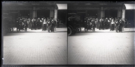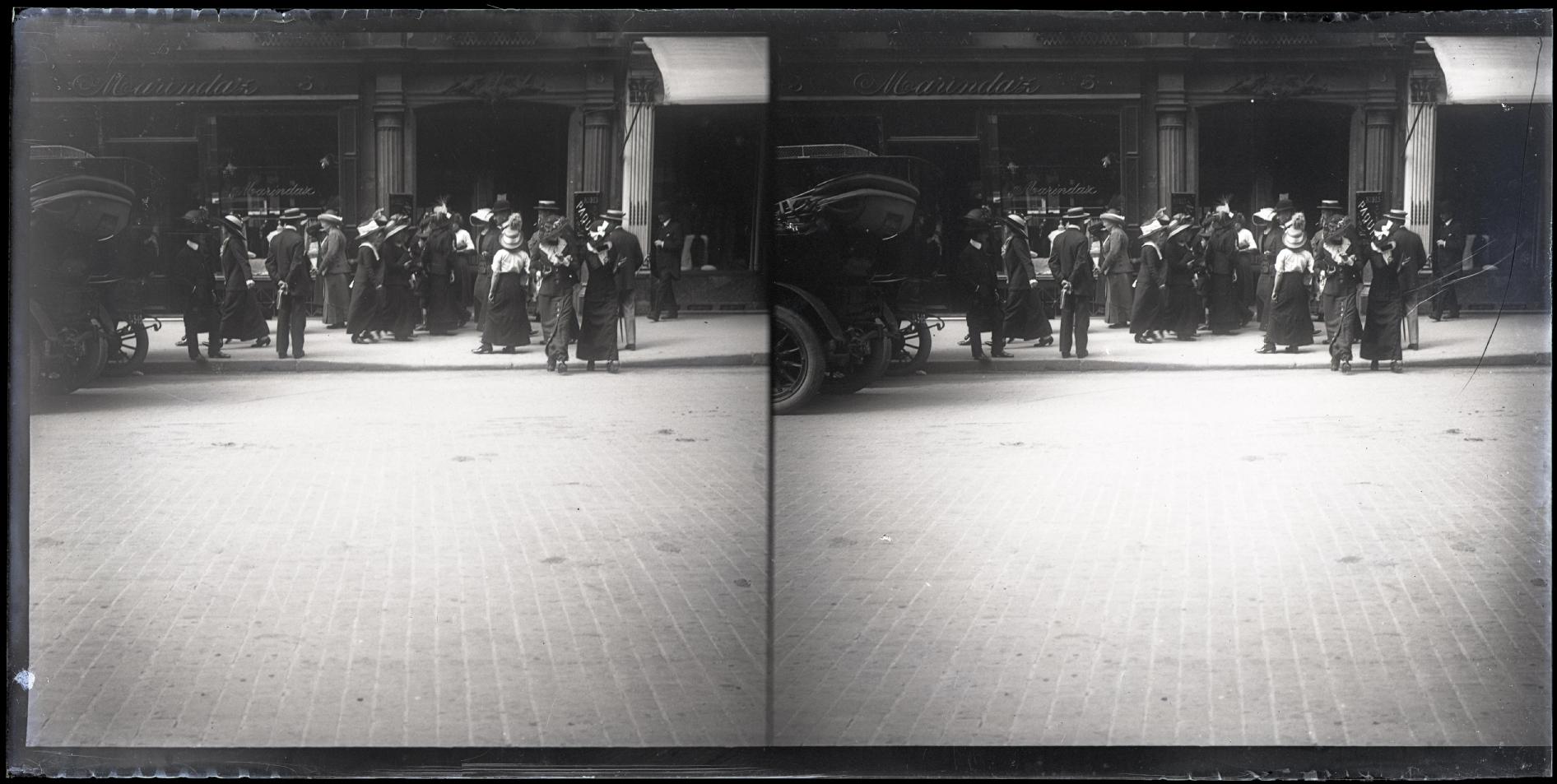 Vista de la calle de la Paz de París tomada desde la acera de enfrente al portal número 3. En primer término, la calzada con 2 mujeres cruzando y la parte trasera de un automóvil en la izquierda. En la acera, un grupo de hombres y mujeres andando ante los escaparates de un establecimiento comercial "Marindaz", junto al portal número 3. En el portal se lee el cartel "ROBES PAQU(IN)" de la casa de costura Paquin.