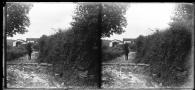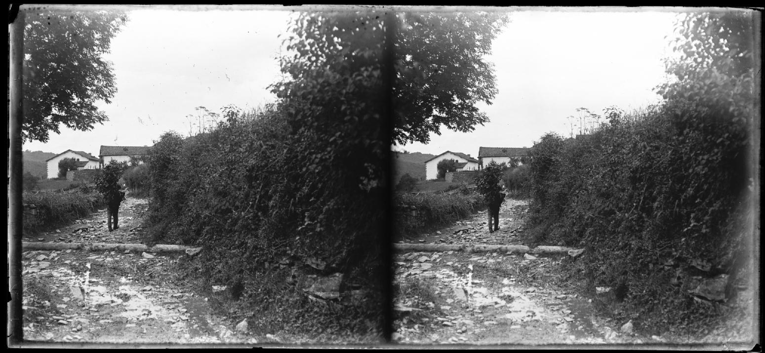 Vista del camino de Bordazar en el término Iturrizcar , tomada desde el norte. En primer término, el camino y un hombre cargado con ramas, en segundo plano las casas del barrio de Abajo de Esáin.