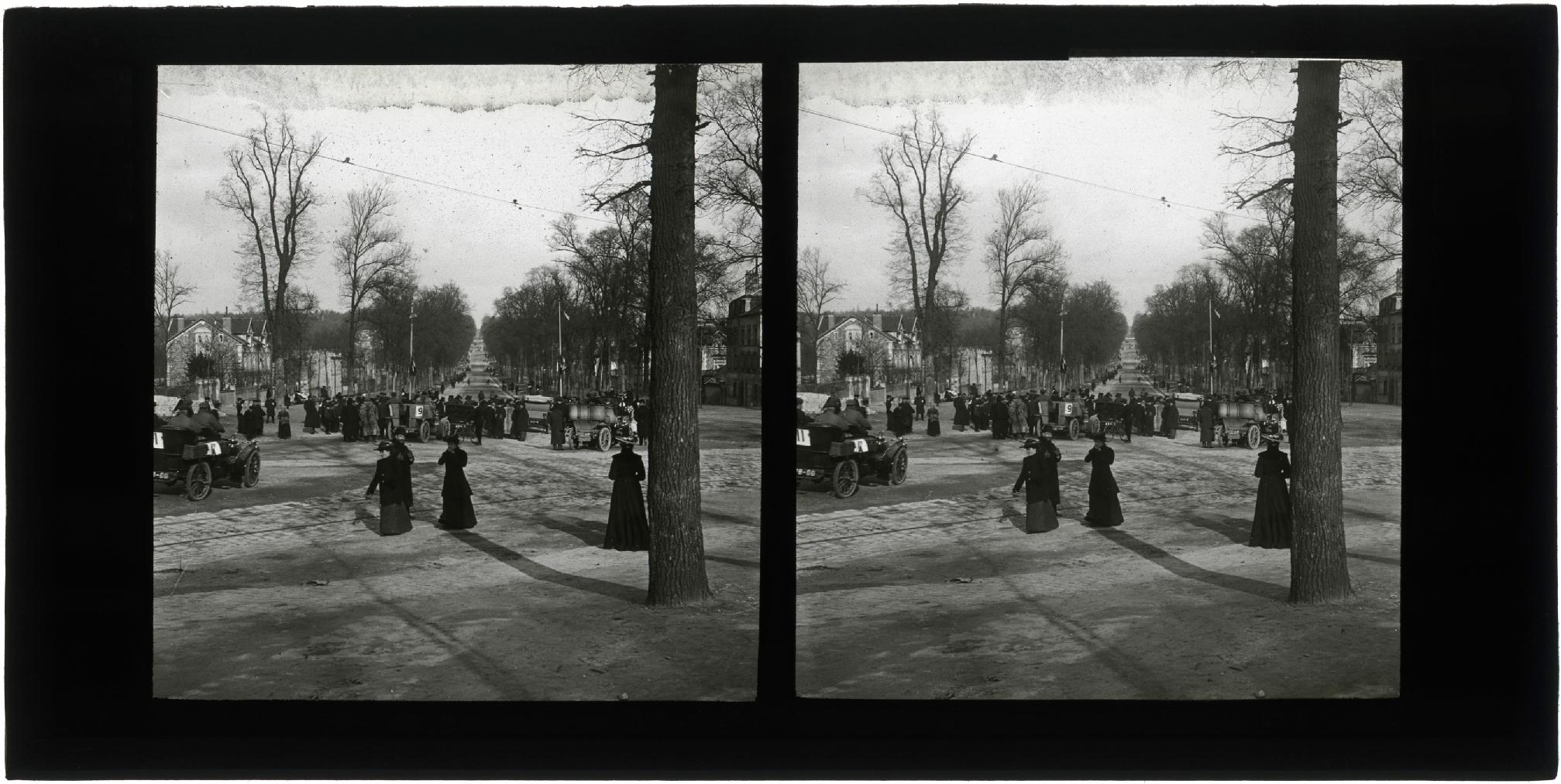• Contenido: Vista de una carretera entre 2 hileras de árboles y un grupo de personas entre coches con etiquetas numeradas en una localidad rural.