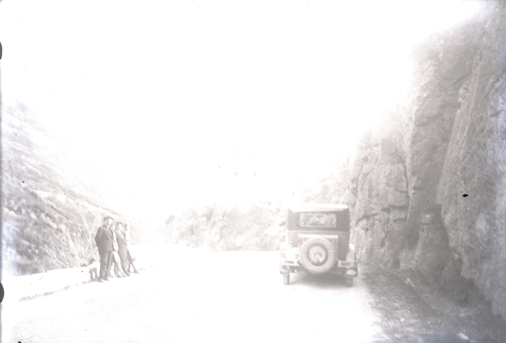 • Contenido: Vista de una carretera. En la derecha, un coche visto desde la parte de atrás, en la izquierda 4 personas; a ambos lados rocas.