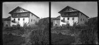 Vista general de la casa de Esáin denominada Landakoa, en la calle San Juan, número 19. En primer término, las huertas y, detrás, la casa con inscripción, balcón y palomar.