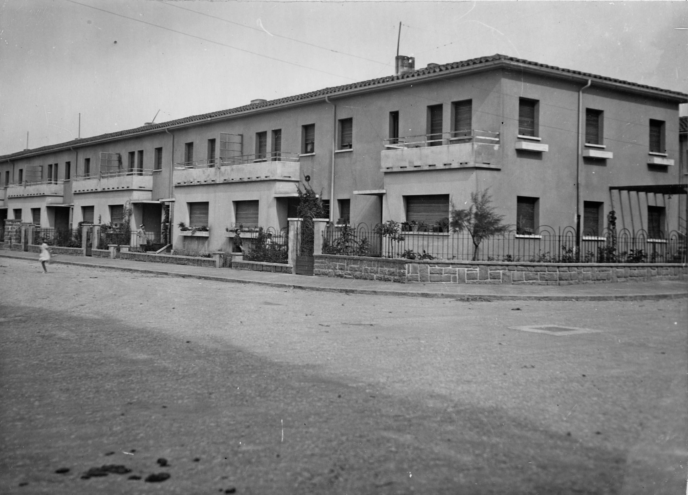 En el reverso, marcas impresas de papel fotográfico Leonar. La fotografía se encuentra adhesivada a una memoria del Ayuntamiento de Pamplona remitida a la Diputación Foral, fechada en agosto de 1938 e integrada exclusivamente por fotografías de José Galle Gallego. Los trabajos de construcción de las viviendas, promovidas por la Diputación Foral para sus empleados, concluyeron en 1937.