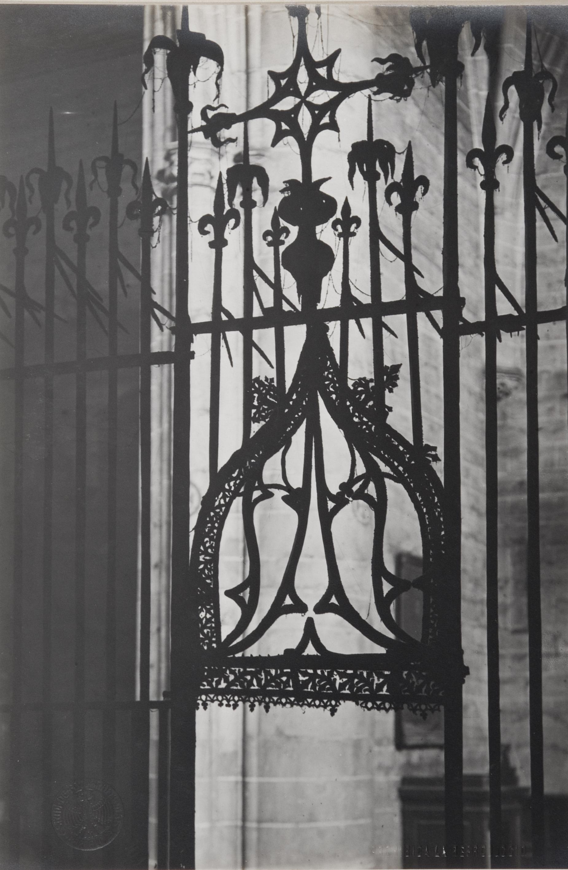 En el anverso, ángulo inferior izquierdo, sello seco del "ESTUDI DE FOTOGRAFIA MAS. BARCELONA". Fotografía instalada sobre soporte secundario encuadernado (tomo 17). En el reverso, ficha impresa del "Museo Iconográfico del Reino" promovido por la Diputación Foral, con anotaciones manuscritas de localización ["Catedral. Verja del altar mayor. Detalle"]. La reja fue elaborada en 1517 por Guillermo Erbenat.