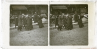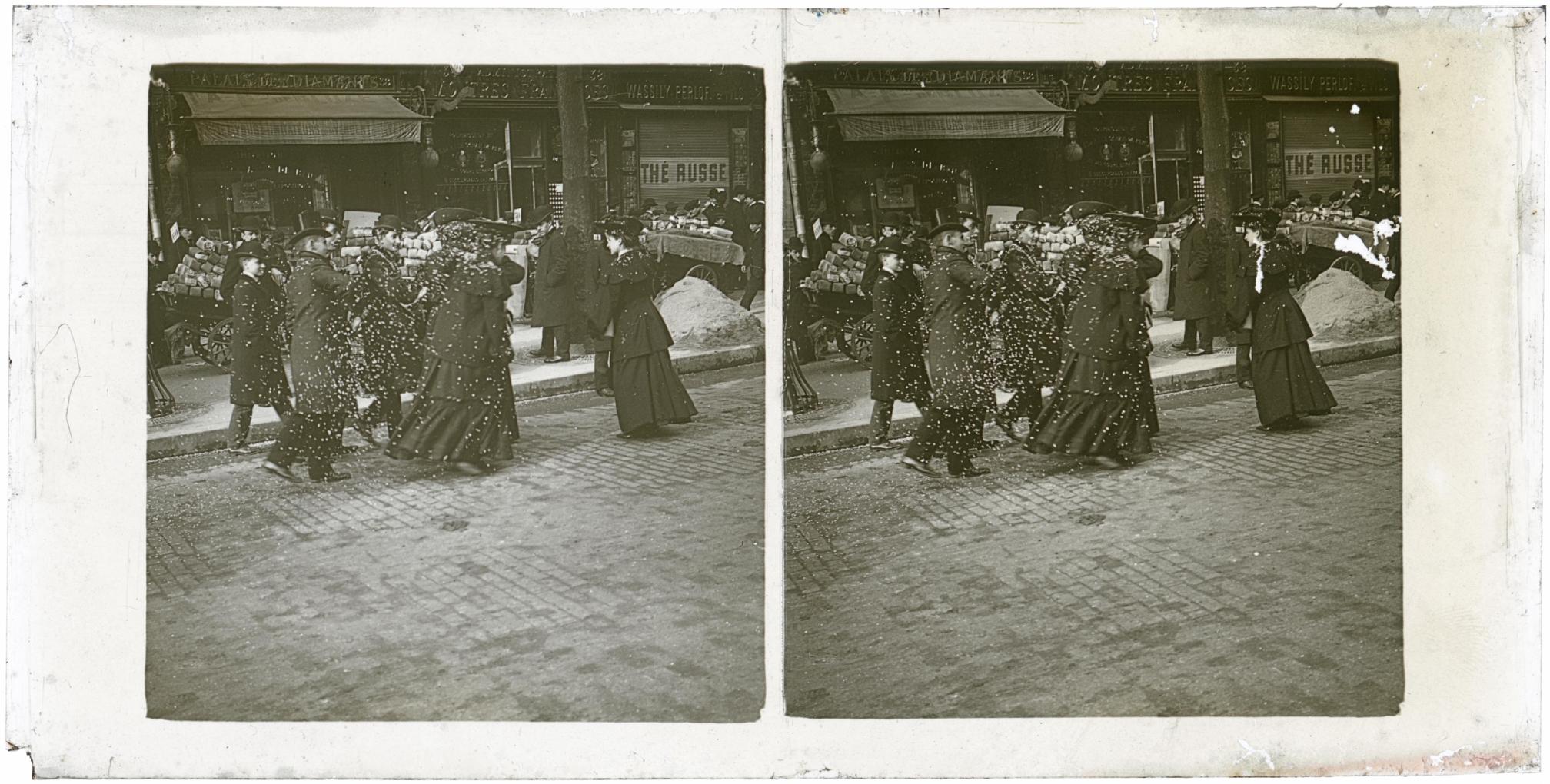 Escena de un grupo de personas andando bajo una nube de confeti en la calzada del boulevard de los Italianos, número 38, de París. En segundo plano, carros con mercancía a la venta y varios establecimientos comerciales con letreros: "PALAIS DES DIAMANTS, 38", "MONTRÈS FRANCAISES", "WASSILY PERLOFF, THER RUSSE" Y "FOURNISSEUR".