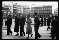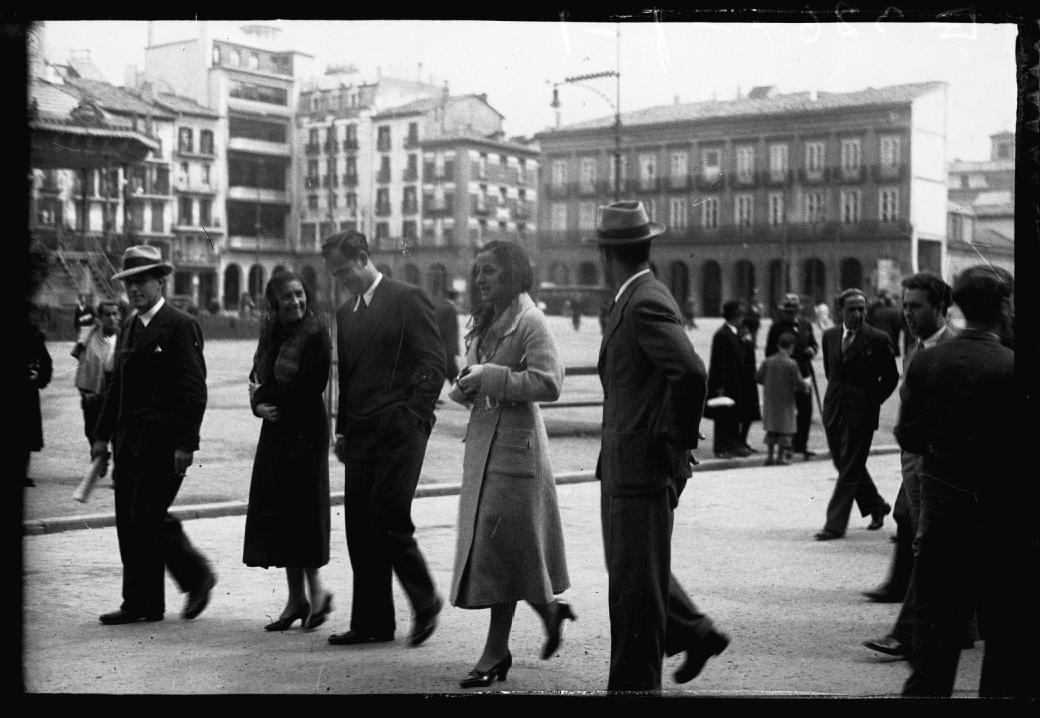 Instantánea de las celebraciones de la Semana Santa en Pamplona, con vista de un grupo de 3 hombres con traje y 2 mujeres con abrigo y mantilla, tomada a su paso por la plaza del Castillo en Pamplona durante su recorrido de visita a los monumentos de Jueves Santo.