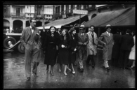 Instantánea con vista de un grupo de 4 hombres jóvenes con traje acompañados por 3 mujeres jóvenes con vestidos, abrigos y mantillas, tomado a su paso por la plaza del Castillo en Pamplona durante su recorrido de visita a los monumentos de Jueves Santo en la ciudad.