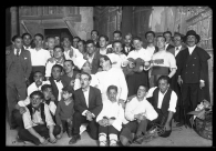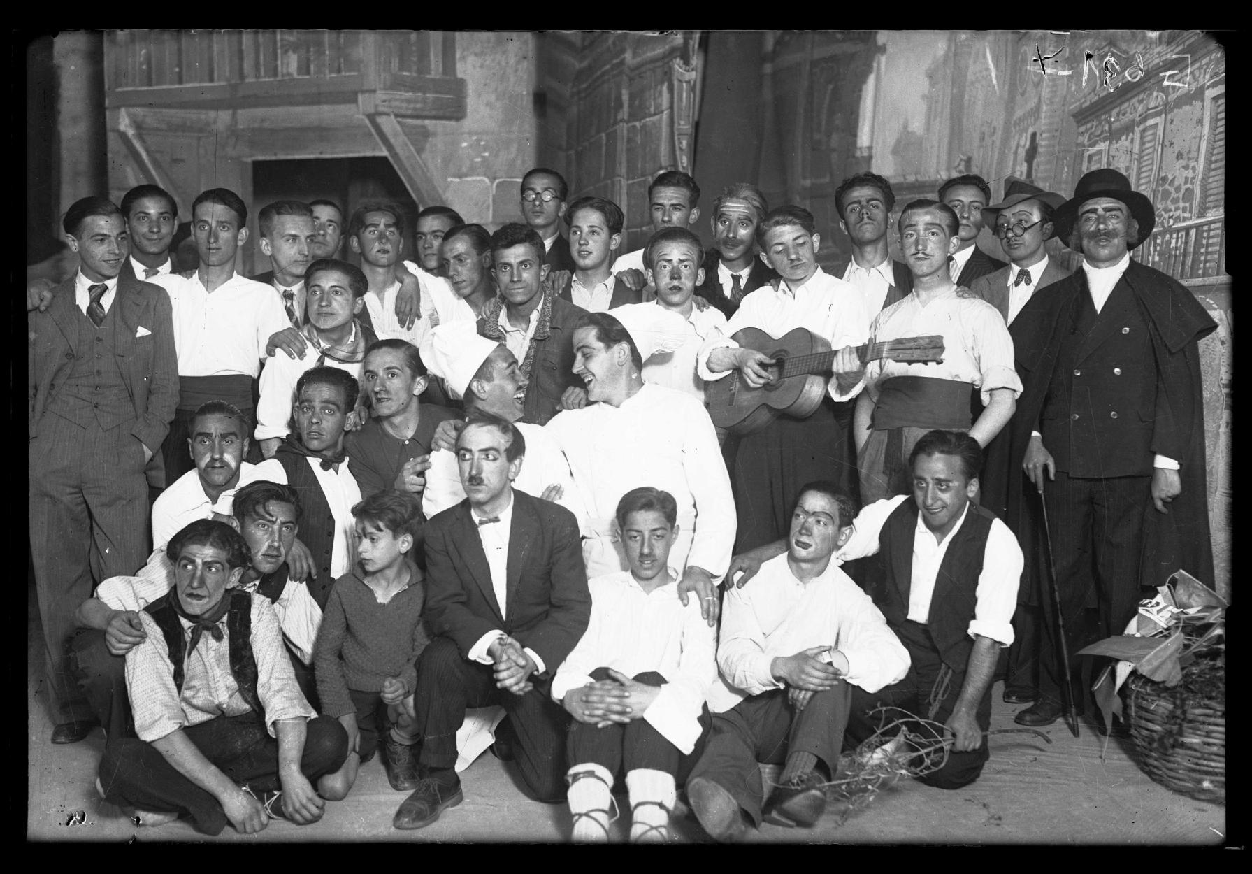 Retrato colectivo de un grupo de 33 muchachos y jóvenes de una compañía de teatro, caracterizados y acompañados por un niño sobre el escenario de un teatro.