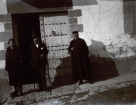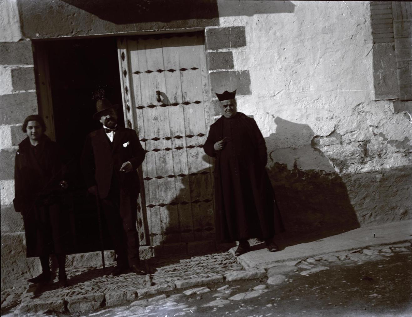 Retrato en plano entero de Concha Oficialdegui Galdeano con Javier Arraiz y Alberto Oficialdegui Núñez en la puerta de entrada de la casa parroquial de la localidad de Ibero el día de su boda. En primer término, de izquierda a derecha, Concha Oficialdegui, Javier Arraiz y Alberto Oficialdegui, párroco de Ibero.