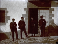 Retrato en plano entero de Concha Oficialdegui Galdeano con 3 hombres en la puerta de entrada de la casa parroquial de la localidad de Ibero el día de su boda. En primer término, de izquierda a derecha, 2 hombres, Concha Oficialdegui y Javier Arraiz.