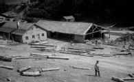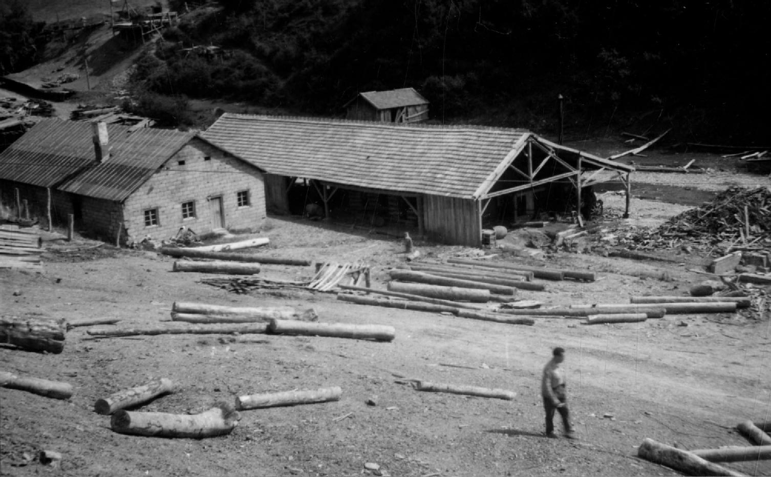 Vista parcial de la serrería de Azcona en Anduña (facería 9), en el término de la Borda de Xirón, tomada desde el este durante la construcción de la carretera Uztárroz - Izalzu (actual NA-140). En primer término, un hombre y troncos de árboles sobre la ladera, ante las instalaciones del aserradero. Tras ellas, el curso del río Anduña.
