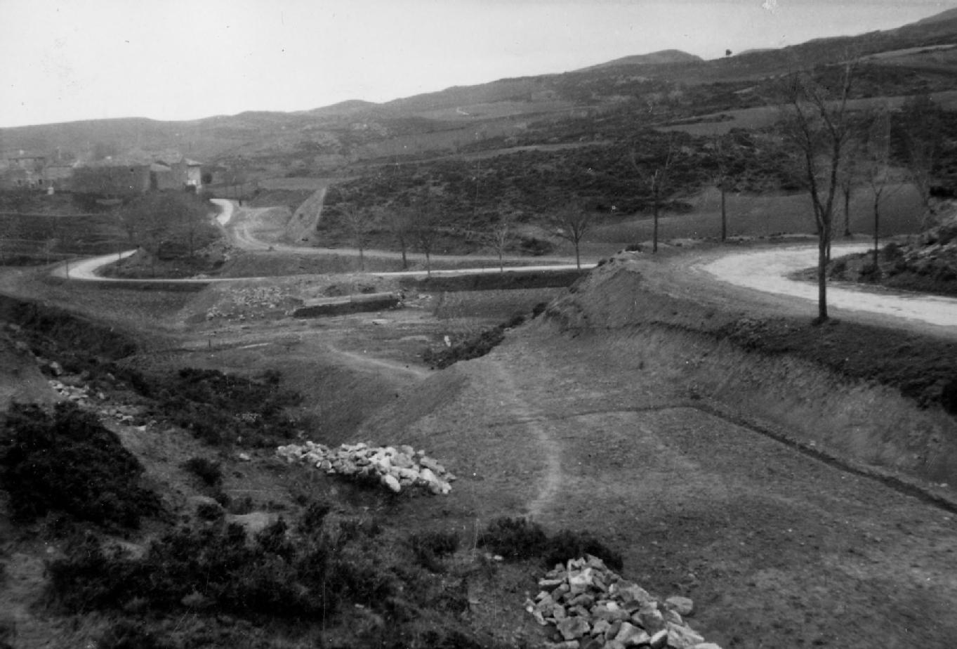 Vista general de los trabajos de construcción de la variante de la carretera Estella - Muniáin de la Solana (actual NA-122) a su paso por Echávarri (Aberin), tomada desde el norte. En el centro, el nuevo trazado en construcción atraviesa en línea recta el paraje. A la derecha, calzada de la carretera en servicio, que discurre sinuoso. Al fondo, ladera de Montejurra.