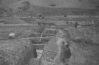 Vista parcial de los trabajos de apertura de una de las zanjas de cimentación de la presa del embalse de La Dehesa en Tarazona (Zaragoza). En primer término, 2 hombres junto a una trinchera abierta en el terreno. Más atrás, plataforma con relleno de piedra correspondiente a la base de la presa.