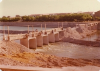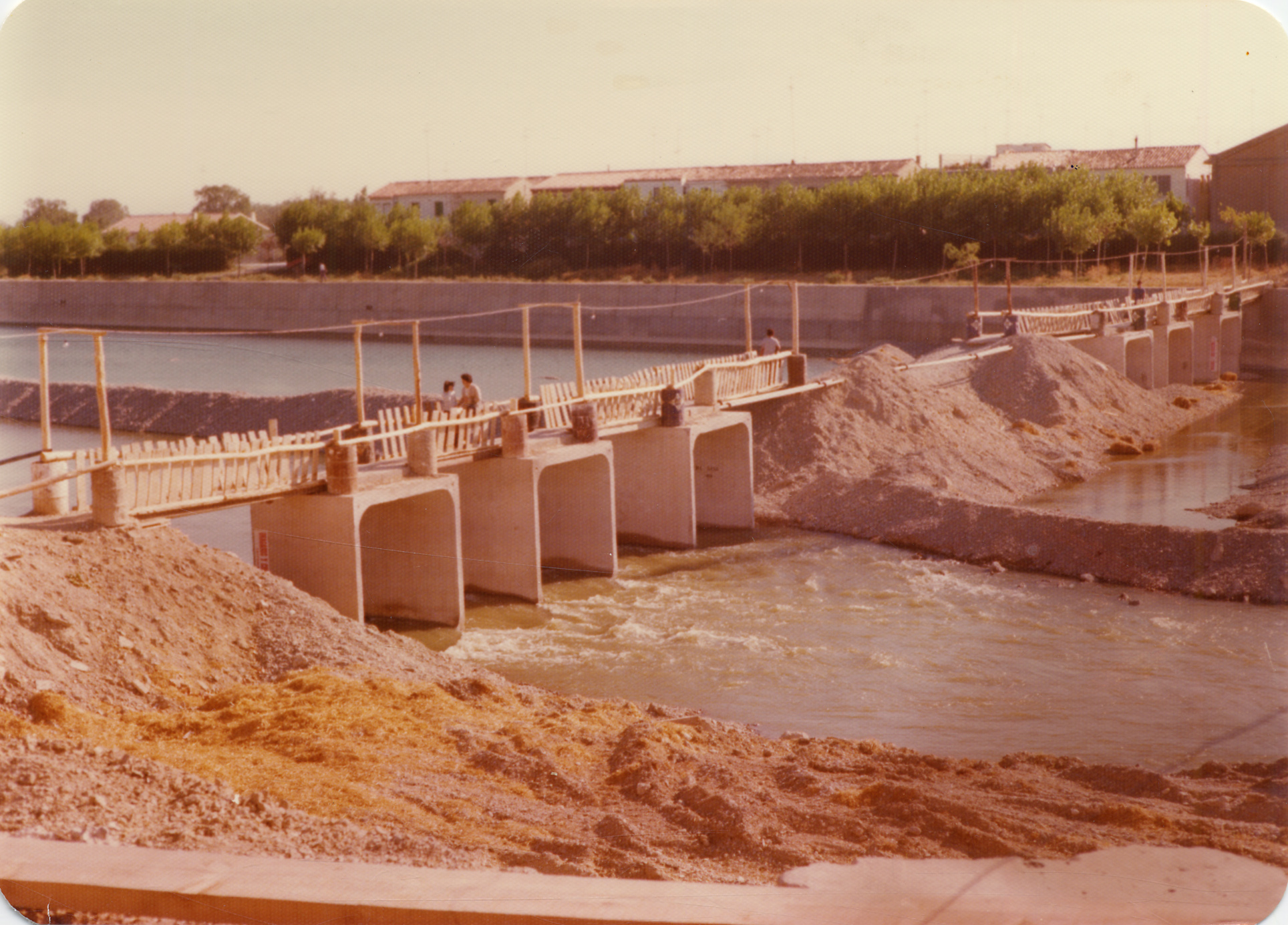 Construcción del nuevo puente flotante sobre el río Arga en Funes. Pasarela provisional para tránsito de peatones.