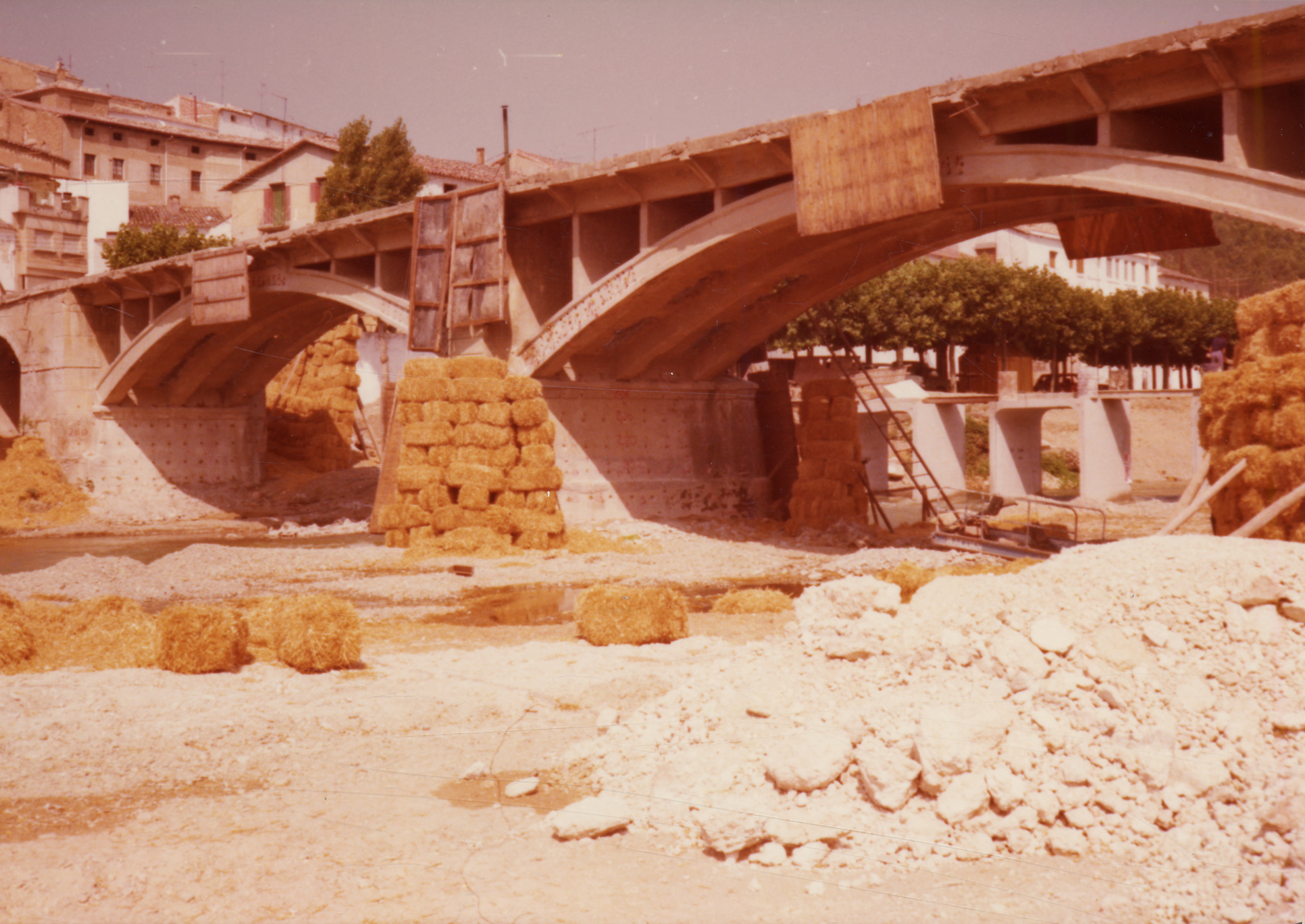 Vista parcial del puente viejo sobre el río Arga en Funes, tomada desde la margen izquierda aguas abajo, al este, el día de su voladura para construcción de un nuevo puente. En el centro, sobre el lecho fluvial, estructura de hormigón del puente con los estribos y pilares protegidos por fardos de paja y entablados de madera sobre los arcos. Tras él, módulos de hormigón sobre el cauce fluvial con una pasarela de madera sobre ellos. Al fondo, casas del centro urbano sobre la margen derecha.