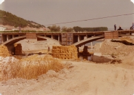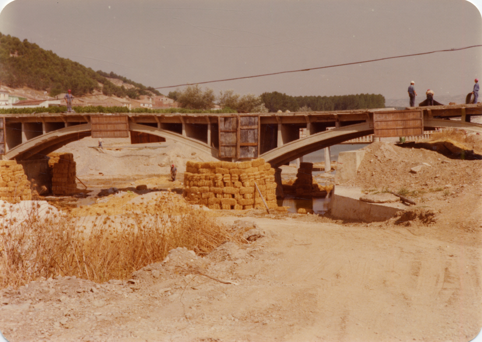 Vista parcial del puente viejo sobre el río Arga en Funes, tomada desde la margen izquierda aguas abajo, al sureste, el día de su voladura para construcción de un nuevo puente. En el centro, sobre el lecho fluvial, tramos orientales del puente de hormigón, con pilares protegidos por fardos de paja y entablados de madera sobre los arcos, sobre los que trabaja un grupo de hombres con casco. A la derecha, bajo el arco del puente viejo, cimentaciones de hormigón del estribo oriental del puente nuevo. Al fondo, casas del centro urbano sobre la margen derecha.