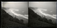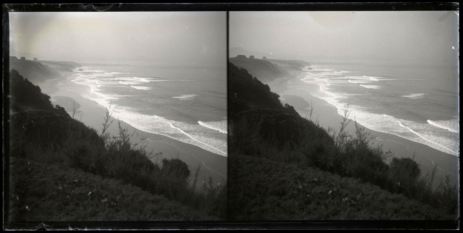 • Contenido: Vista panorámica de la playas la costa atlántica en la zona de Biarritz. En primer término, la ladera. En segundo plano la playa y el mar rompiendo en la orilla.