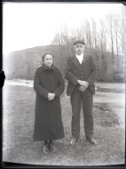 • Contenido: Retrato en plano entero de Concepción Olagüe y Cruz Orrio en la orilla del río Ulzama a su paso por la localidad de Villava, Navarra.