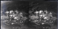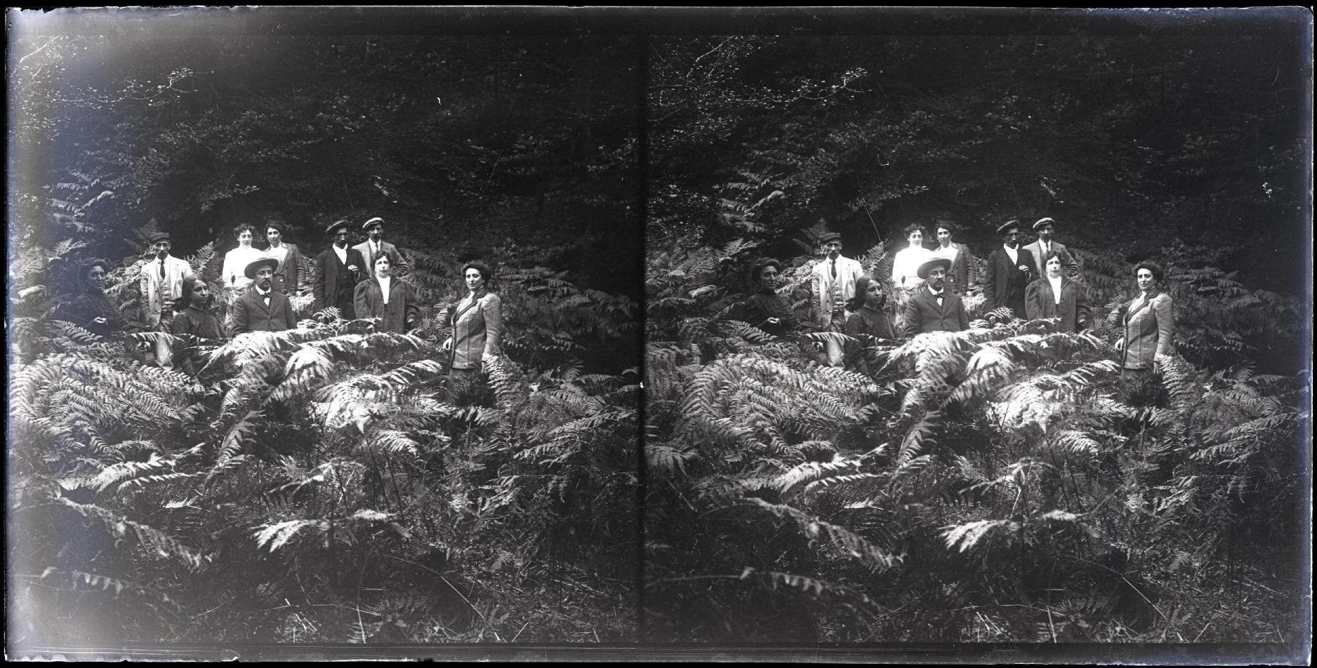 Retrato en plano entero de Dorotea Fernández Morales, mujer de Pedro Ciga Mayo, con un grupo de amigos y familiares entre los helechos del monte del Señorío de Bertiz en Oyeregui, Bertizarana.