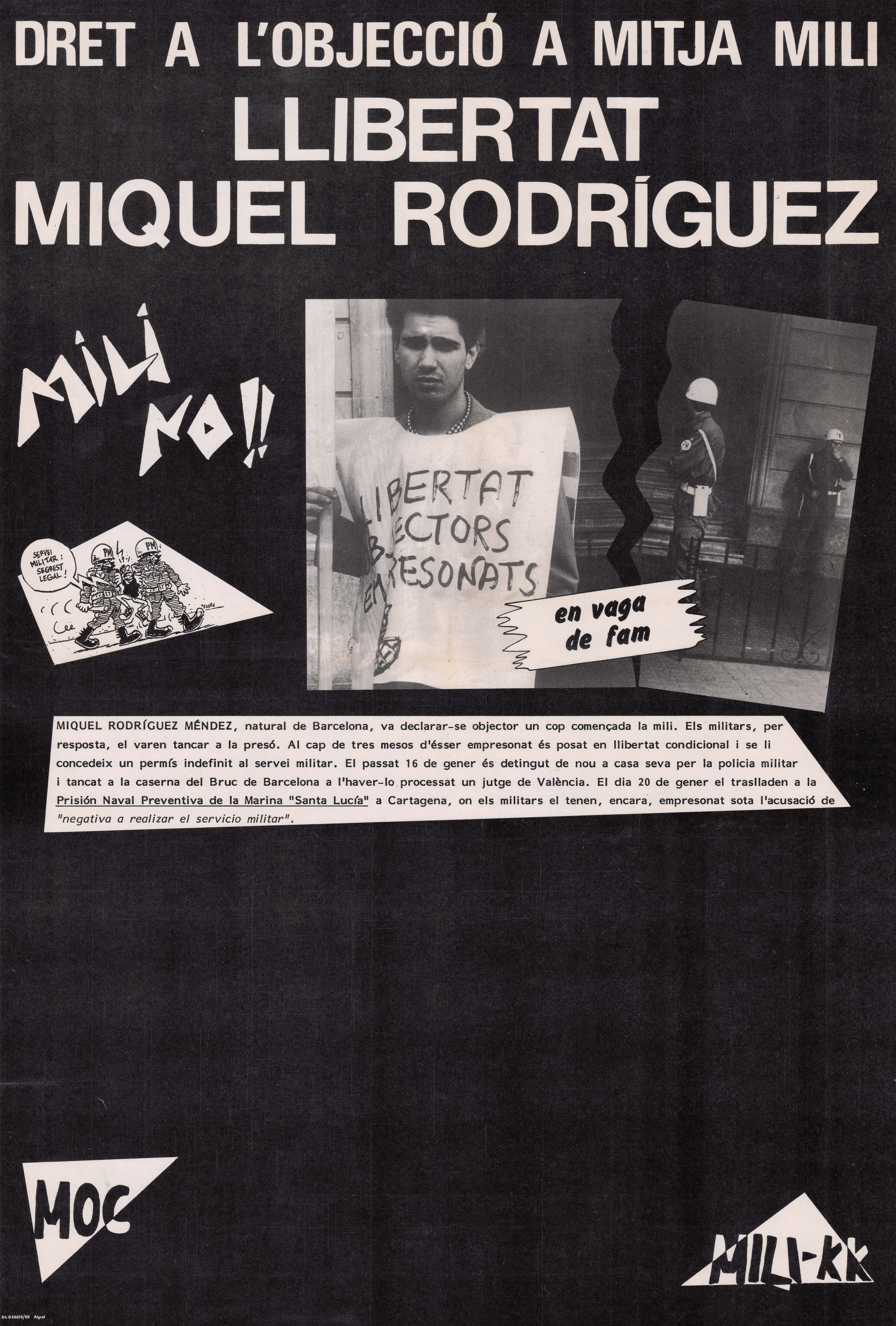 Campaña catalana, y en catalán, reclamando el derecho a la objeción de conciencia y pidiendo la libertad del objetor Miquel Rodríguez, en huelga de hambre, y próximo a ser juzgado en Valencia.