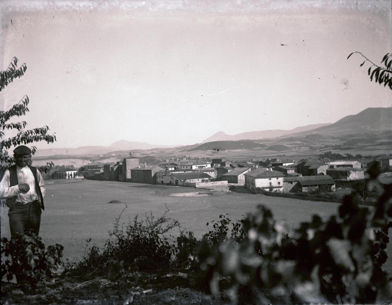 Vista general picada de la localidad de Echauri, tomada desde la ladera de la sierra de Sarbil, desde el noroeste. En primer término, en la izquierda, un hombre, en segundo plano la localidad de Echauri, al fondo, las sierras de Erreniega y Alaiz, con la Iga de Monreal.