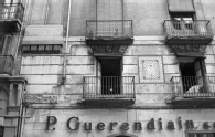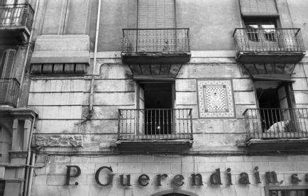 Vista parcial de la primera planta de la fachada de la calle Mercaderes del edificio de la calle Estafeta, número 1, de Pamplona. En la parte inferior, el rótulo del establecimiento comercial "P. Guerendian, s.a."