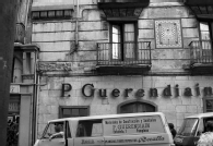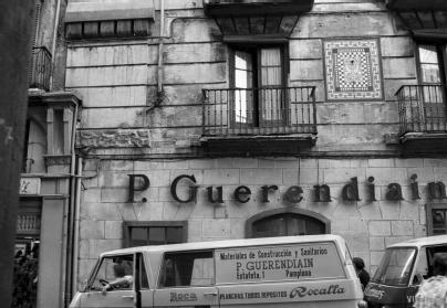 Vista de la planta baja de la fachada de la calle Mercaderes del edificio de la calle Estafeta, número 1, de Pamplona. En primer término, una furgoneta con los rótulos "Roca" "Materiales de Construcción y sanitarios / P. GUERENDIAIN / Estafeta, 1 - Pamplona" y "PLANCHAS, TUBOS, DEPOSITOS Rocalla". En segundo plano, el establecimiento comercial con el rótulo "P. Guerendiain".