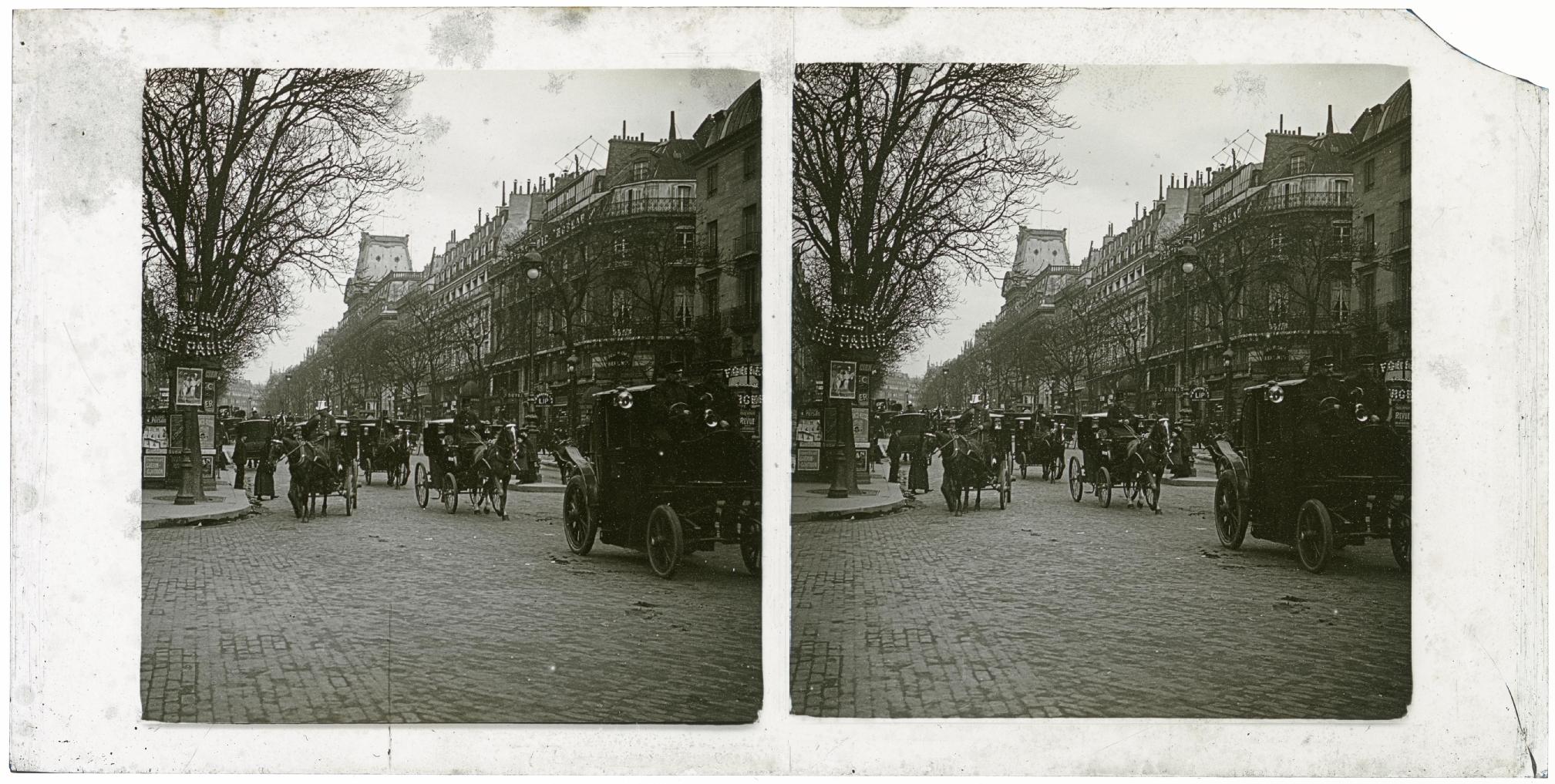 Vista del bulevar de los Italianos de París, tomada desde el oeste. En primer término, la calzada con un automóvil y varios carruajes tirados por caballos. En segundo plano, el edificio del Credit Lyonnais, situado en el número 17-21 de la calle. En los árboles de la izquierda, un cartel luminoso del Casino de París y, en la derecha, del Folies Bergère.