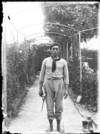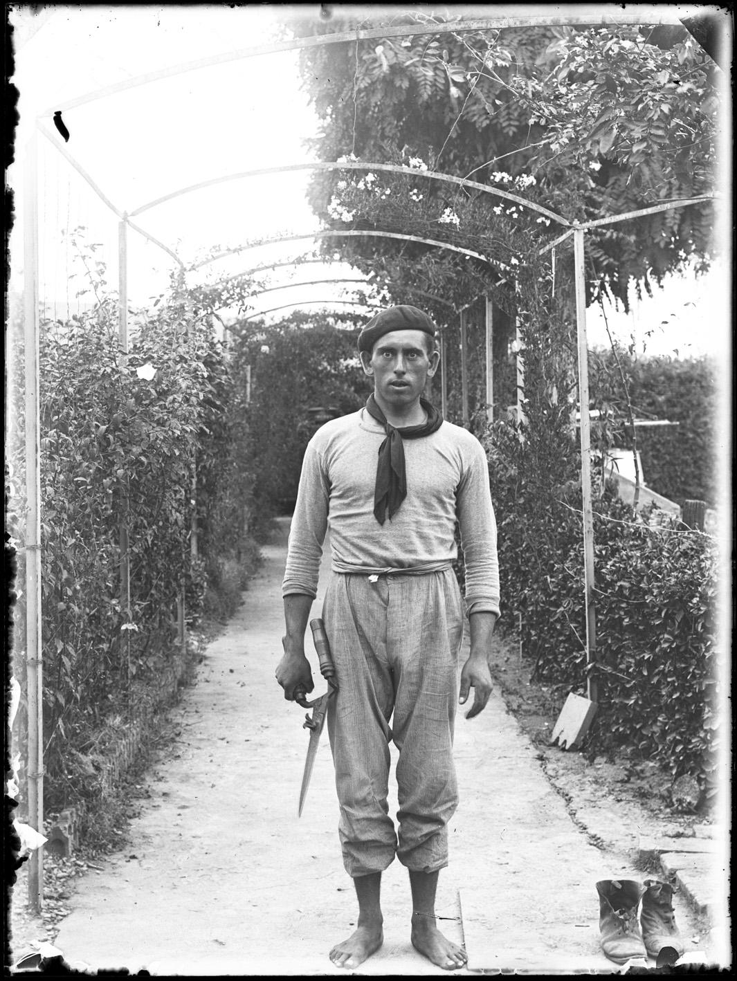 Retrato en plano entero del jardinero con tijeras de podar en el jardín de "Garden House", la casa de recreo de la familia Altadill Aldave situada en el paraje de La Magdalena en Pamplona.