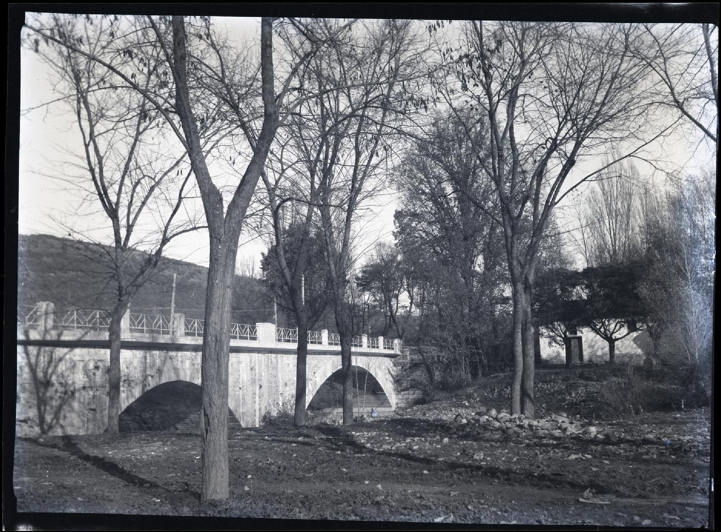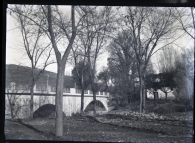 Vista del puente de San Andrés sobre el río Ulzama en la localidad de Villava, tomada desde la orilla derecha aguas abajo. Al fondo, en la derecha, un edificio del molino.
