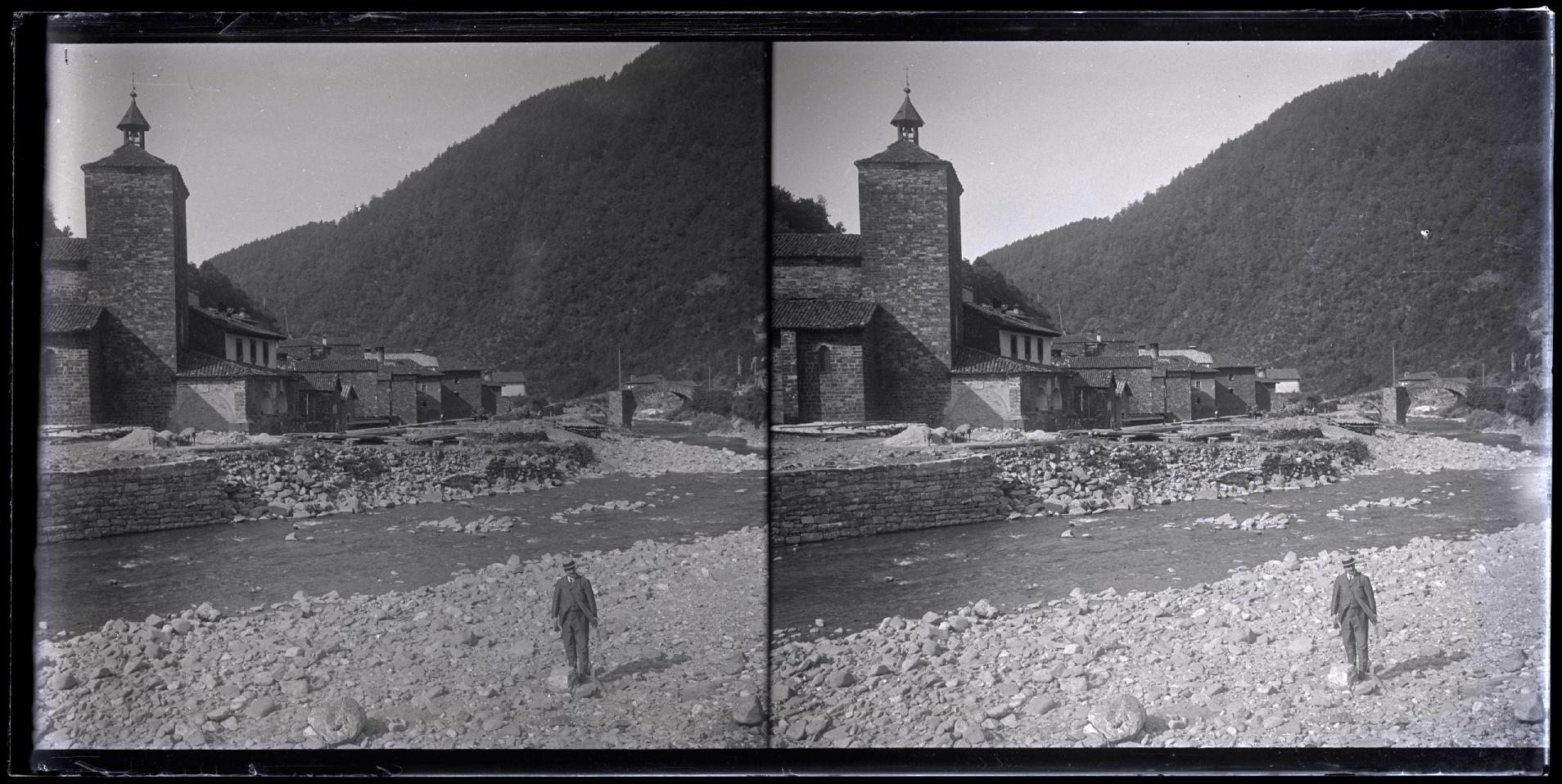 Vista del río Esca a su paso por la localidad navarra de Urzainqui, tomada desde el norte. En primer término, en la orilla, un hombre con canotier. En segundo plano, el cauce del río y las casa del núcleo de población con la iglesia de San Martín. Al fondo, en la derecha, el antiguo puente de piedra.