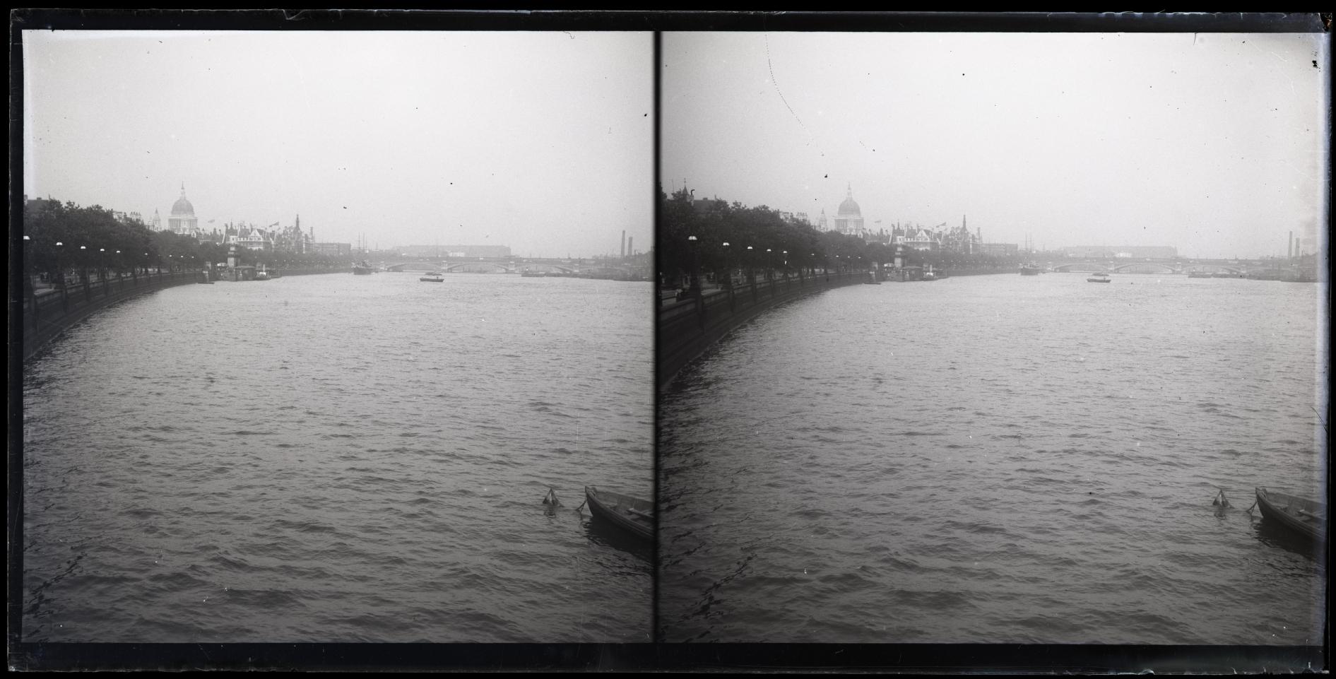• Contenido: Vista del cauce del río Támesis en Londres. En primer término, el río con una barca y el paseo de la orilla. Al fondo, la cúpula de la catedral de San Pablo y el puente Blackfriars.