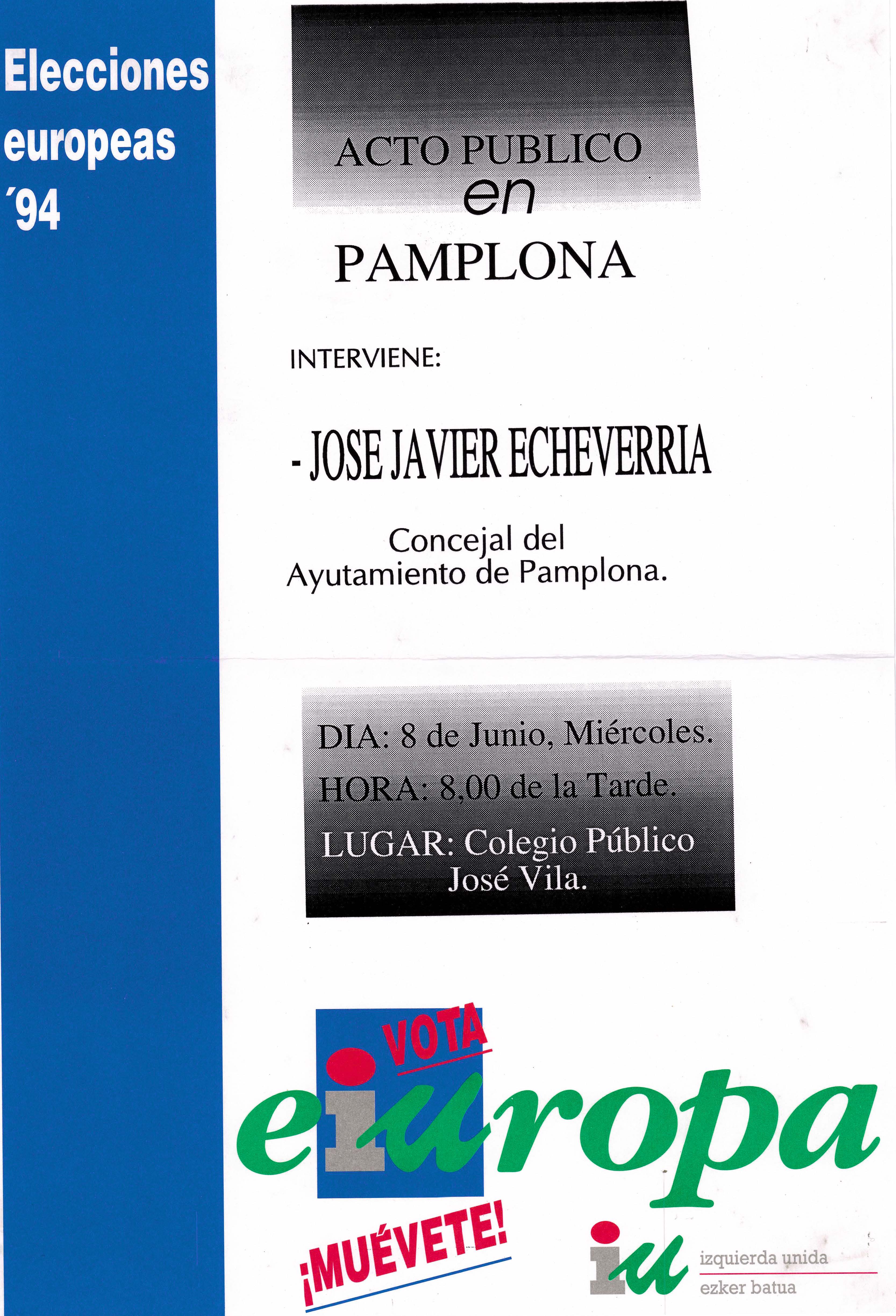Convocatoria de un acto electoral en el Colegio Público José Vilá para el 8 de junio en el que se anuncia la intervención de José Javier Echeverria, concejal del Ayuntamiento de Pamplona.