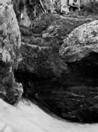 Vista en picado de la boquilla de la presa del embalse de Alloz. En primer término, paramento exterior de hormigón de la presa entre paredes rocosas. Más atrás, fondo del desfiladero con canalizaciones de la central hidroeléctica de Alloz.